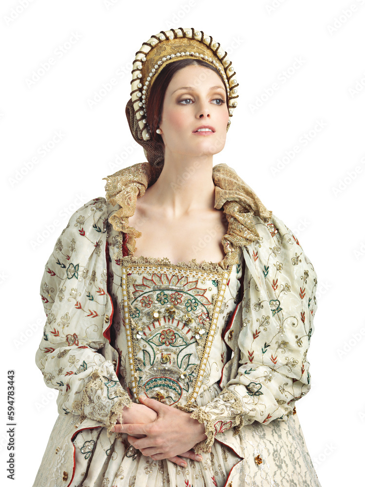Theatre costume, medieval queen and luxury vintage fashion for main character in historic stage performance. History, acting and woman renaissance theater actor isolated on transparent png background #594783443