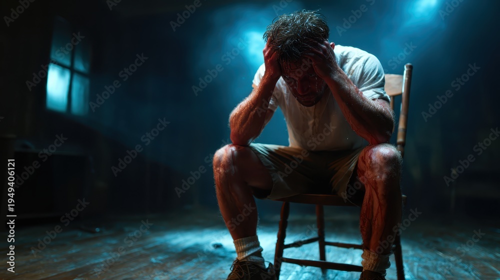This powerful image portrays a man in emotional distress, seated in a dimly lit room, capturing raw human emotions and the profound struggles and complexities of mental health. #1949406121