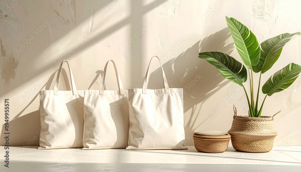 Three blank canvas tote bags for eco-friendly branding mockups, elegantly displayed on a minimalist shelf with natural light and soft shadows #1949955571