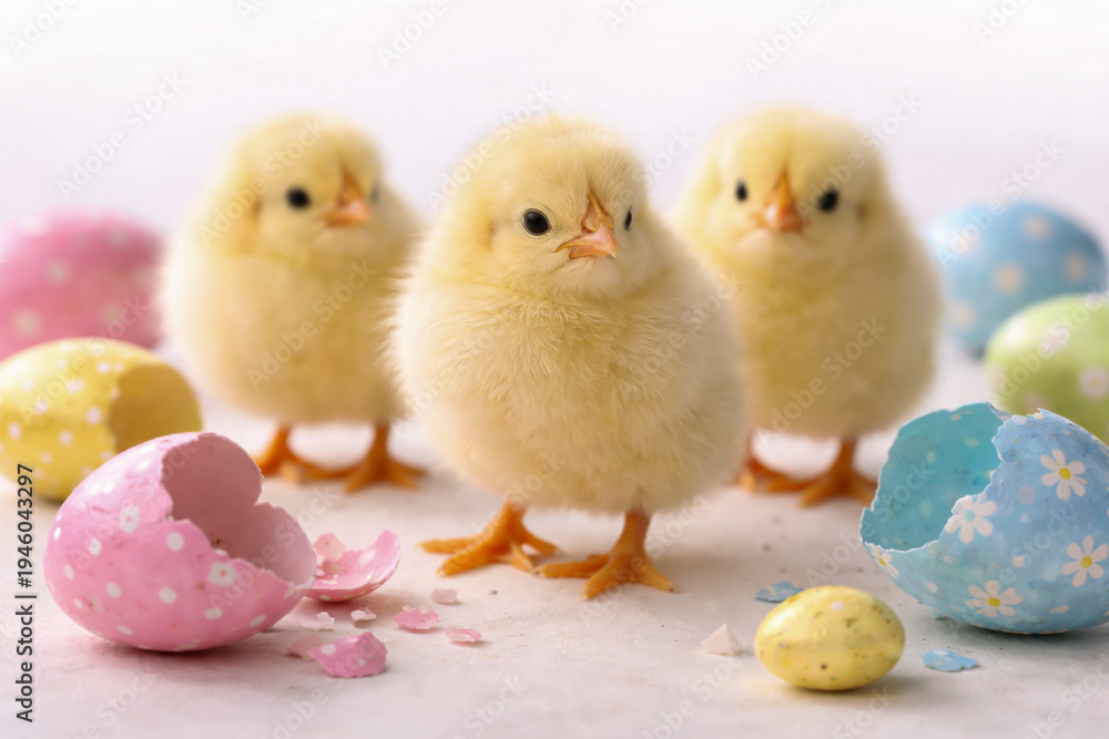 Three fluffy yellow chicks standing among broken colorful Easter eggs on soft background spring holiday concept #1946043297