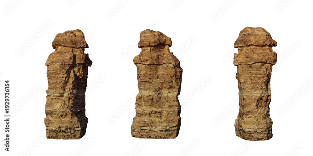 Three Sandstone Hoodoos Isolated On White Background — 3D Rendering Of Rock Formations #1929736154