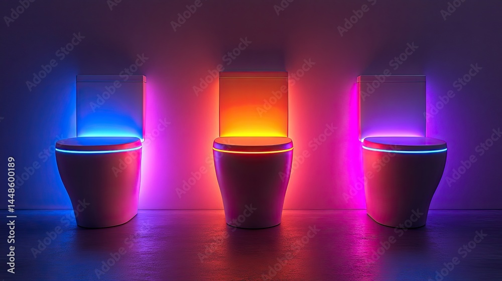Three toilets with colorful neon lights behind them, in a modern bathroom. #1448600189