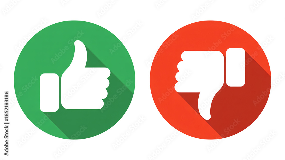 Thumbs up and thumbs down icons in green and red circles with shadow effect on white background for social media #1852193186