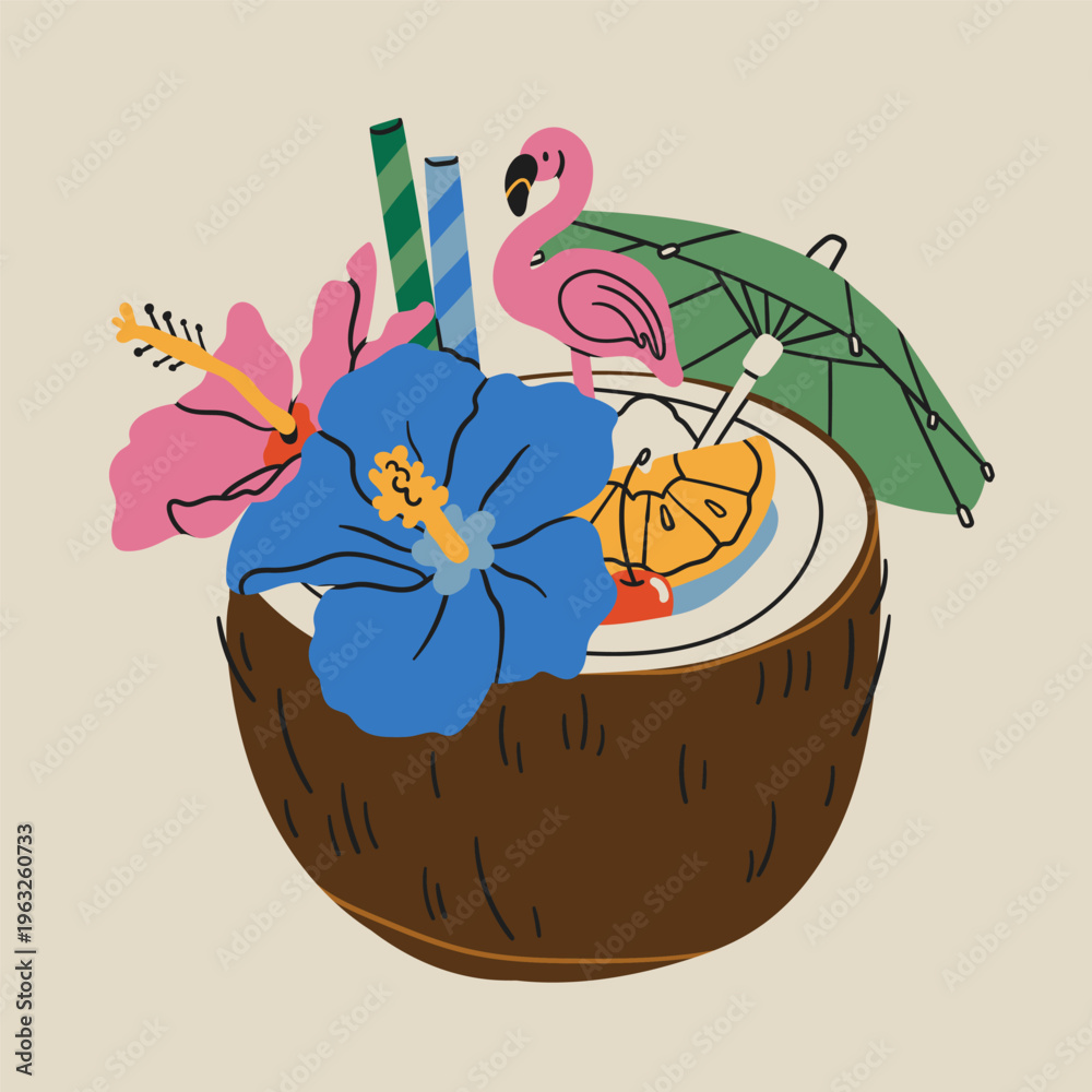 Tiki bar. Summer Cocktail. Refreshing drink with fruit, flowers, straw, umbrella. Coconut shell glass. Hand drawn Vector illustration. Isolated design element. Logo, sticker, print template #1963260733