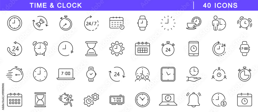 Time icons set. Time and clock icons in line style. Editable web icons timer, watch, speed, calendar, alarm clock, date and time management. Vector illustration. #1911809616