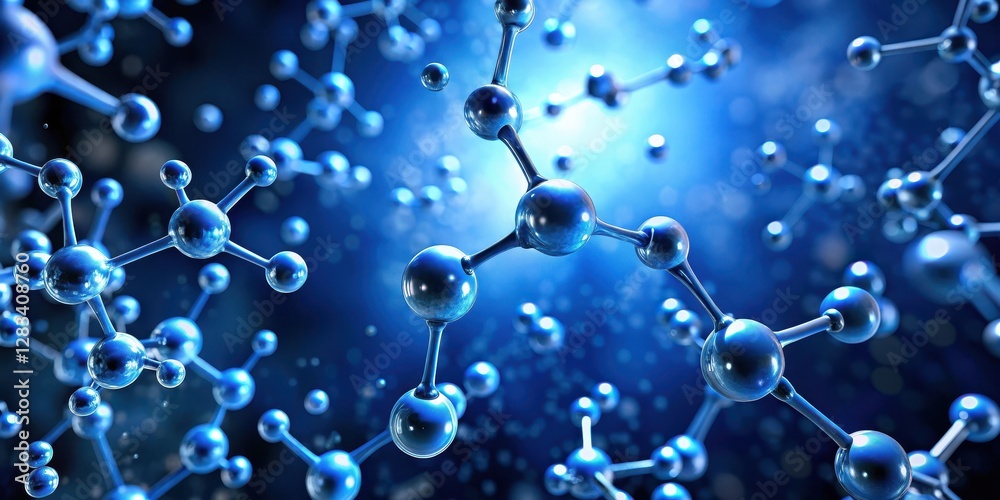 Tiny molecules of ammonia gas suspended in a dark blue liquid, with faint glowing particles scattered around them , gas #1283408760