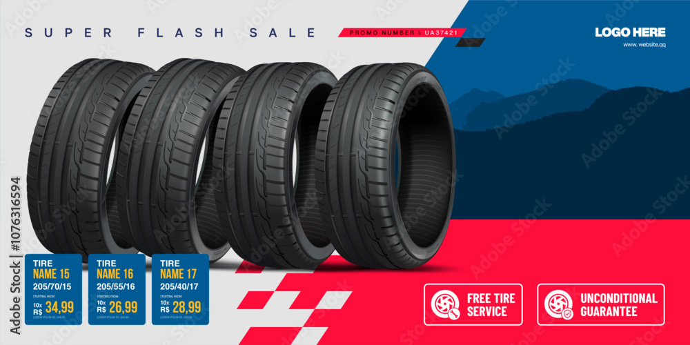 Tire banner advertisement poster. Car tires wheels set. #1076316594