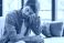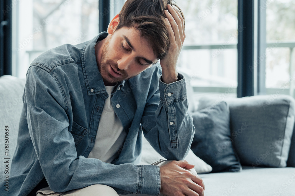 Tired Caucasian young man sit on couch touch massage head suffer from headache or migraine, exhausted millennial male feel fatigue having sleep deprivation or dizziness, eyesight problem concept #1781501639