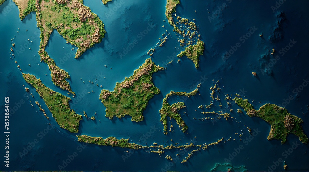 Top down aerial view of the Indonesian archipelago showcasing lush green islands surrounded by deep blue ocean waters #1595854163