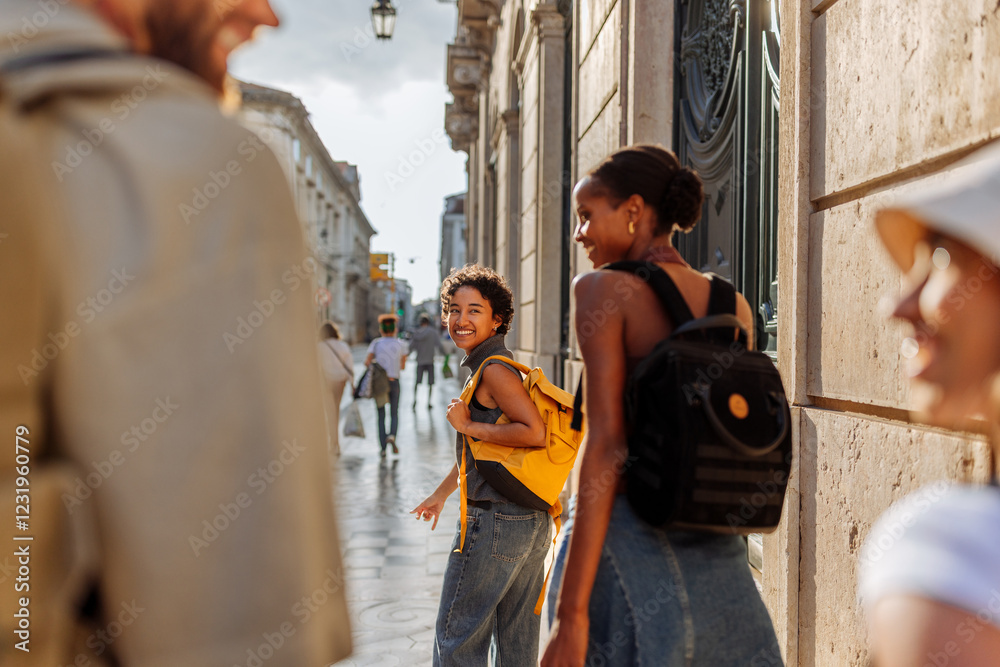 Tourists walking down sunny street in european city during summer vacation #1231960779