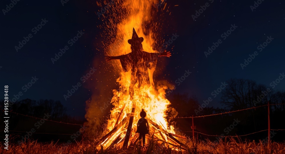 Traditional midsummer bonfire with flames engulfing a witch effigy and doll figure #1915289418