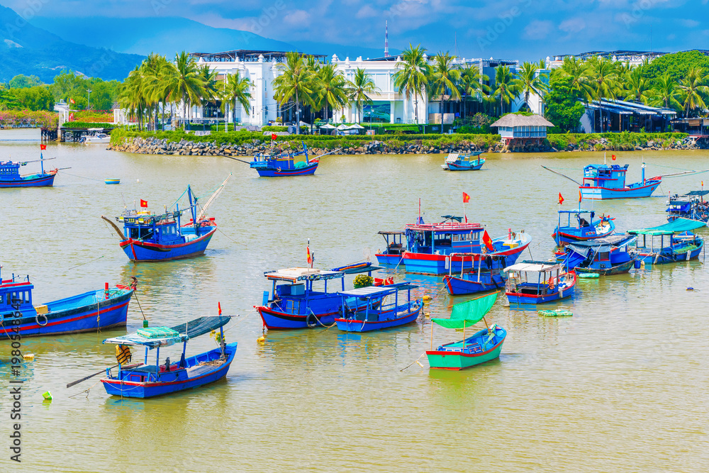 Traditional Vietnamese wooden fishing boats on Cai River in the port. View of the Cai River in Nha Trang in Vietnam #1980548641