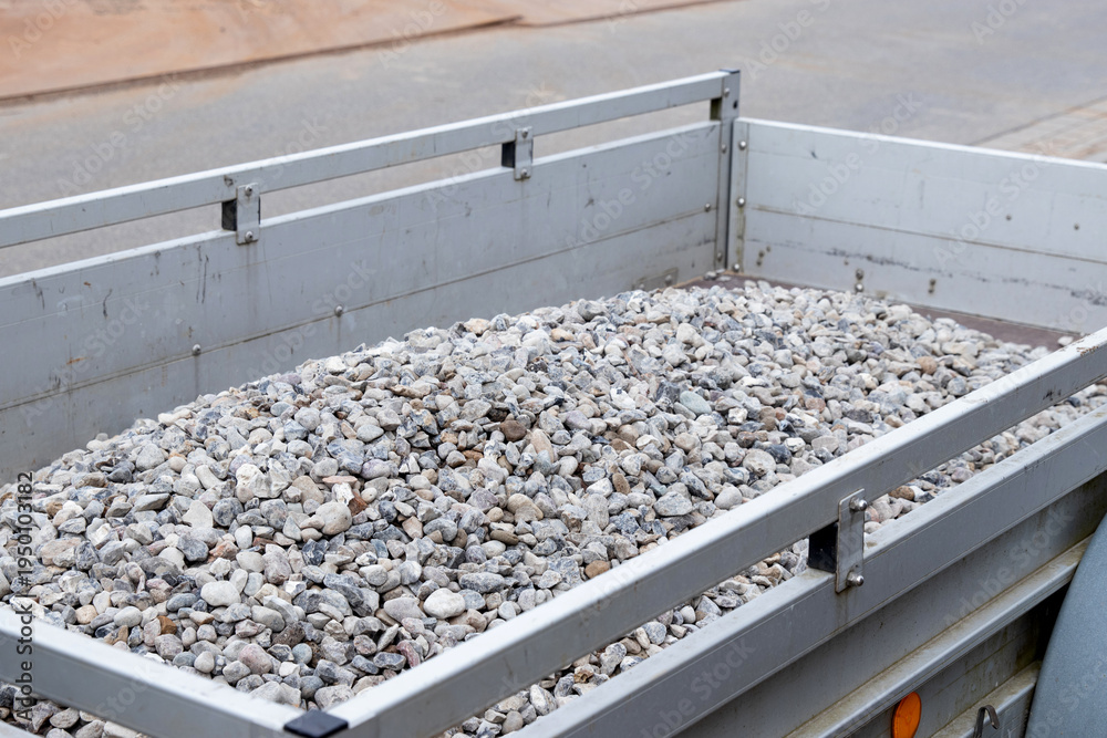 Trailer filled with small gravel stones parked on a construction site, showing a close-up view of the gravel texture and the trailer's metal structure #1950103182