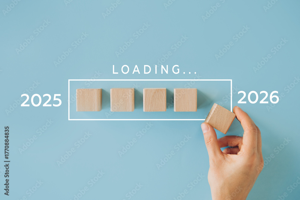 Transition from 2025 to 2026 loading concept with wooden cubes. Represents time passing, preparation for the new year, planning, and progress #1770884835