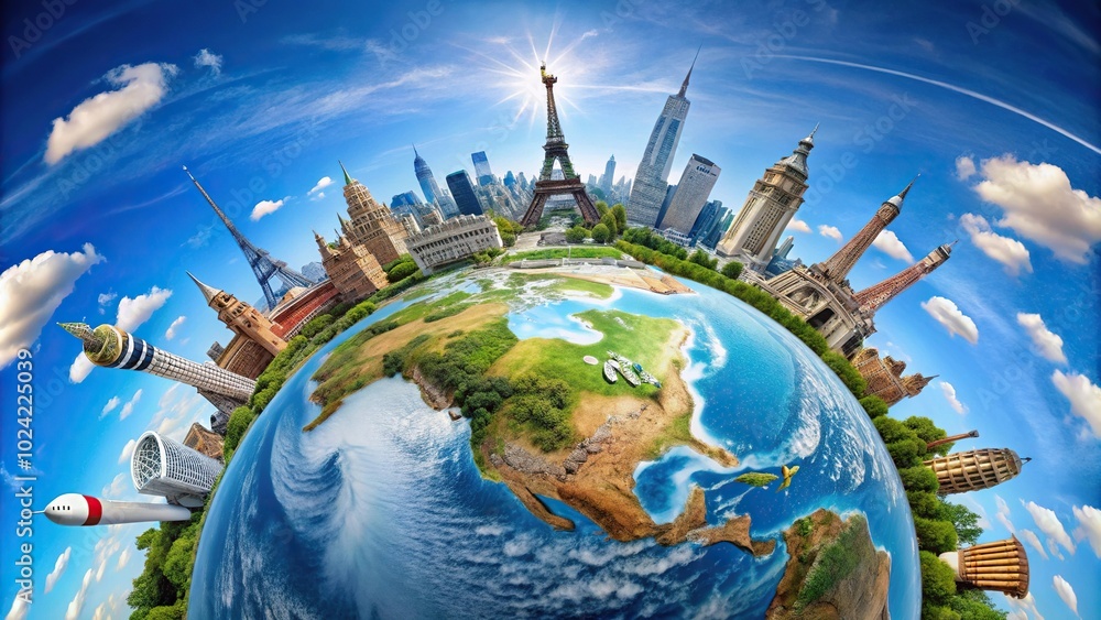 Travel destinations captured with a fisheye lens against a clear blue sky #1024225039