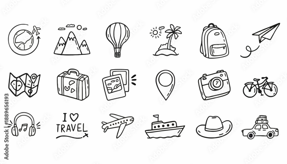 Travel icons including a globe with a plane, various modes of transportation, and a hot air balloon floating above a palm tree, with a backpack and camera. #1889656193