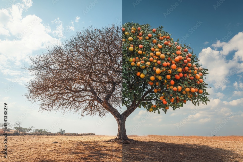 Tree showing stark contrast between barren and fruitful sides #1241388279