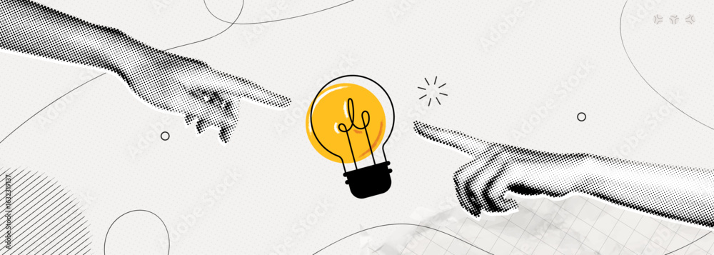 Trendy Halftone Collage Two Hands with lightbulb. Creative mind or brainstorm. Create creative idea concept. Business solutions. Think outside the box. Marketing time. Contemporary vector art #1632319137