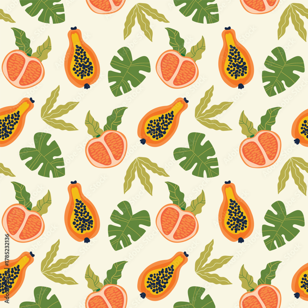 Tropical seamless pattern. Bright illustration-style background, texture with papaya, grapefruit, and leaves. Flat vector illustration. #1785232136