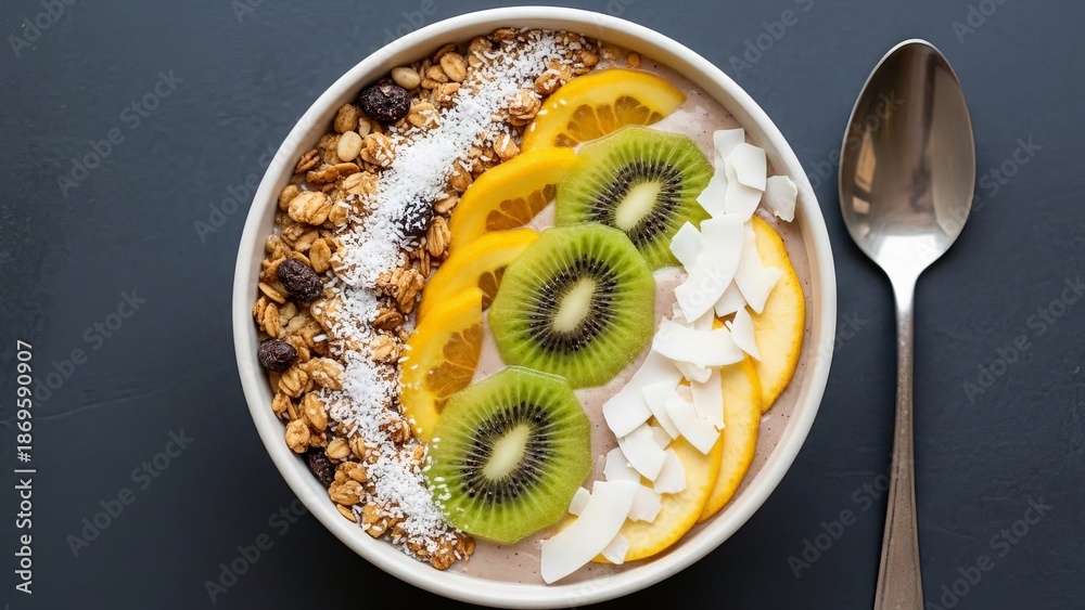 Tropical Smoothie Bowl with Kiwi, Orange, Granola, and Coconut #1869590907