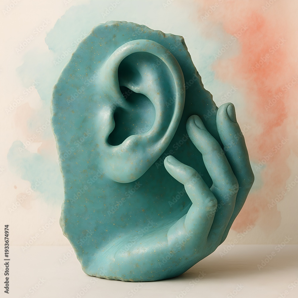 Turquoise Ear Sculpture with Hand – Conceptual Listening and Communication Art #1933674974