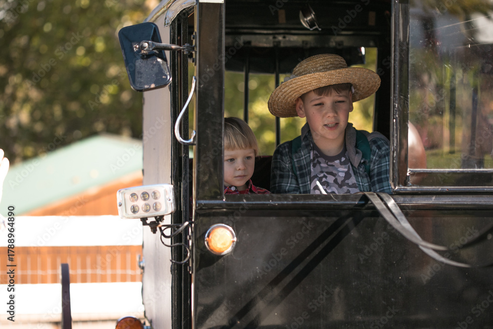 Two Amish boys, ages 2 and 10, sitting together in a traditional horse-drawn carriage. #1788964890