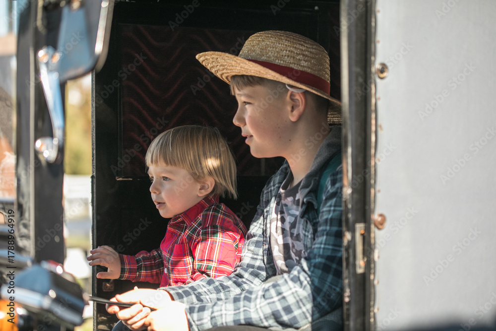 Two Amish boys, ages 2 and 10, sitting together in a traditional horse-drawn carriage. #1788964919