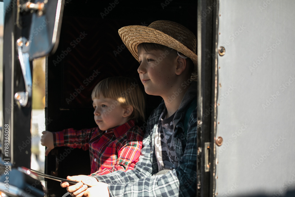 Two Amish boys, ages 2 and 10, sitting together in a traditional horse-drawn carriage. #1788965058
