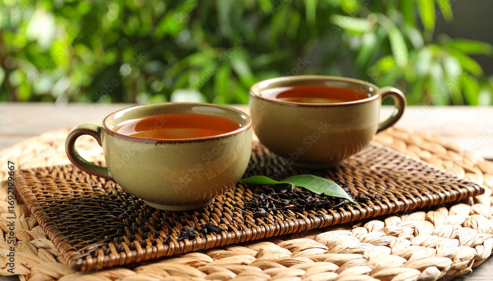Two Ceramic Cups of Hot Tea with Loose Leaves on Woven Mat – AI Generated #1692129667