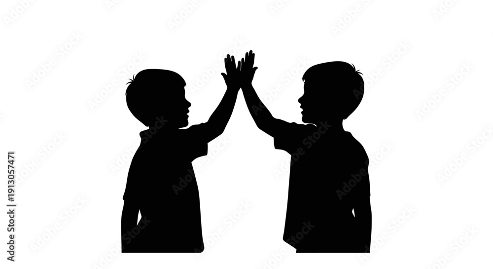 Two Children Silhouettes High Fiving Each Other. #1913057471