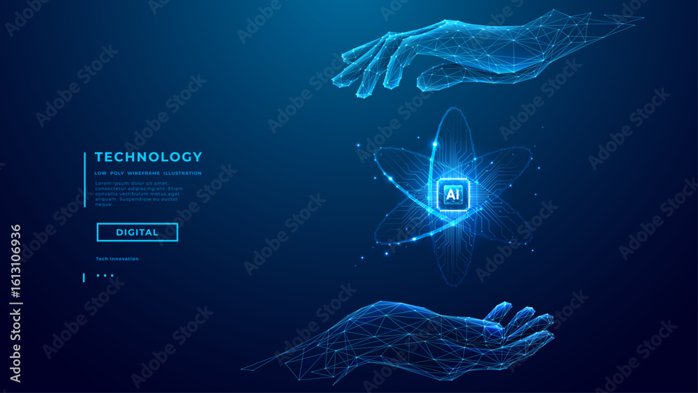 Two Digital Hands Holding AI chip with nuclear atom icon with circuit. Blue Low Poly Wireframe Illustration on Dark Blue Background. Science and Technology Innovation Concept. Vector illustration. #1613106936