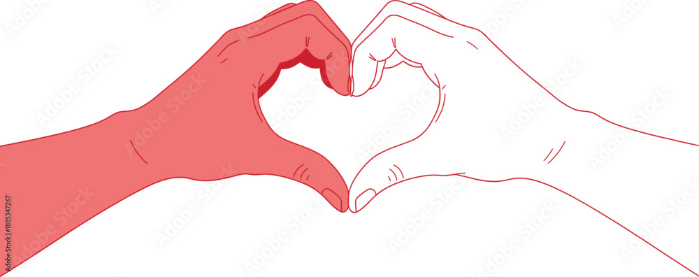 Two distinct hands one red and one white come together precisely in the center to form a universal symbol of connection and deep affection #1885347267