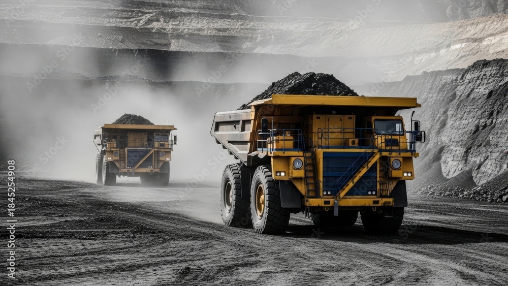 Two giant yellow mining dump trucks hauling coal or ore through heavy dust in a massive open-pit quarry under a dusty sky, symbolizing industry power and heavy construction logistics. #1845254908