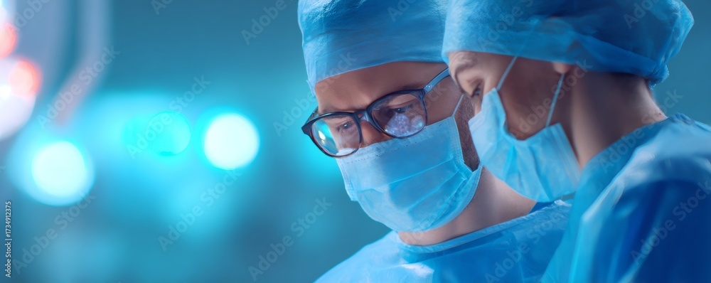 Two medical workers performing surgery with blurred lights. Doctor and surgeon working in operating room. Modern medicine and advanced technology concept. #1734912375