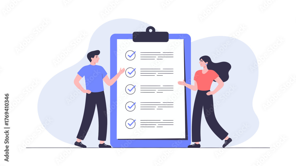 Two people reviewing a completed checklist on a large clipboard with multiple items marked as done and checked off #1769410346