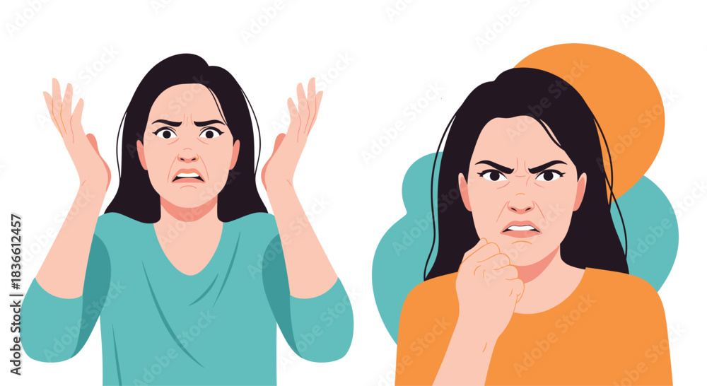 Two portraits of an angry and frustrated young woman, one with hands up in exasperation and the other with a clenched fist. This illustration depicts rage, irritation, and negative emotions. #1836612457