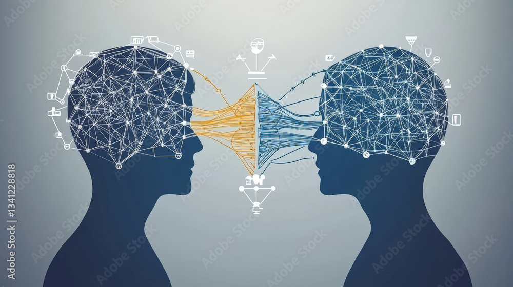Two silhouetted heads connected by neural networks, symbolizing communication and knowledge exchange. image uses abstract lines and nodes to represent data flow and information sharing #1341228818