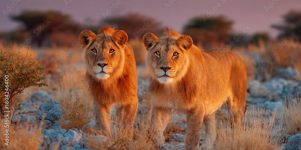 two young lions in the golden evening sun, cute young lions at sunset, lion duo in warm twilight light #1804246400