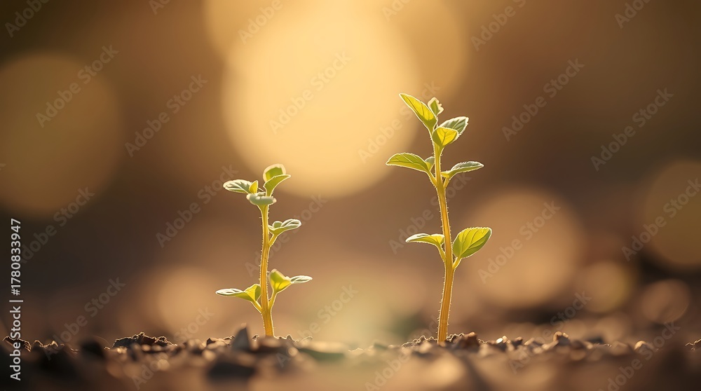 Two young seedlings growing in soil, backlit by the sun, symbolizing new life and growth concept #1780833947