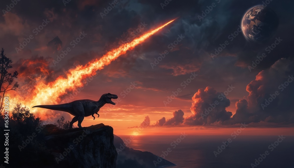 Tyrannosaurus Rex stands on cliff edge, gazing at fiery meteor streaking across dramatic sunset sky towards Earth. Prehistoric scene impending extinction event with majestic dinosaur witnessing #1636213230
