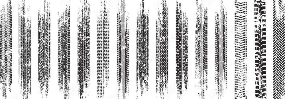 Tyre Trace Vector Grunge Set, Dirty Tires Marks and Treads Vector Collection #1758429361