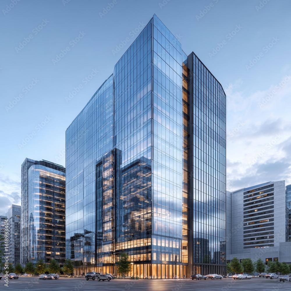 Ultra quality image of modern glass office building with reflective , sleek architecture, and city skyline background under clear sky du daytime. #1618983404