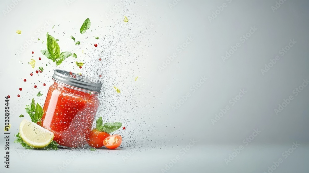 Un frasco de salsa de tomate rodeado de hierbas, lima, especias y tomates, con elementos dispersándose creativamente en el aire. #1033895444