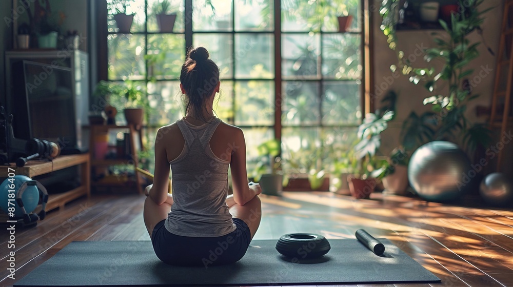 Una persona seduta in silenzio, che si prepara e alla propria routine di allenamento. #871816407