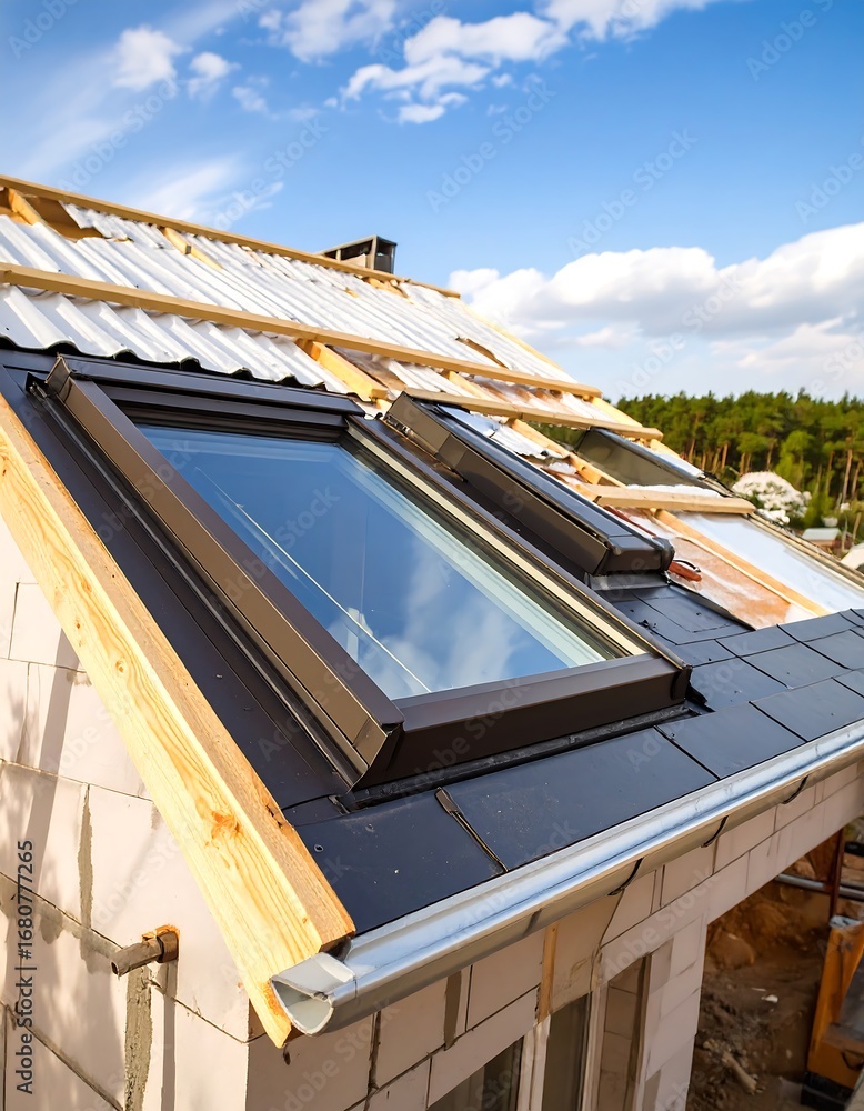Under construction home roof with skylights and gutters against a partly cloudy sky. #1680777265