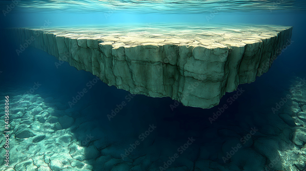 Underwater shot of a massive flat light-colored platform with a rough vertical surface sea floor is textured with rip #1415688066