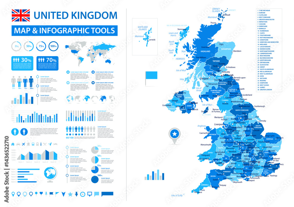 United Kingdom Infographic Map with Data Visualization Elements - Vector Map of Great Britain #1436522710
