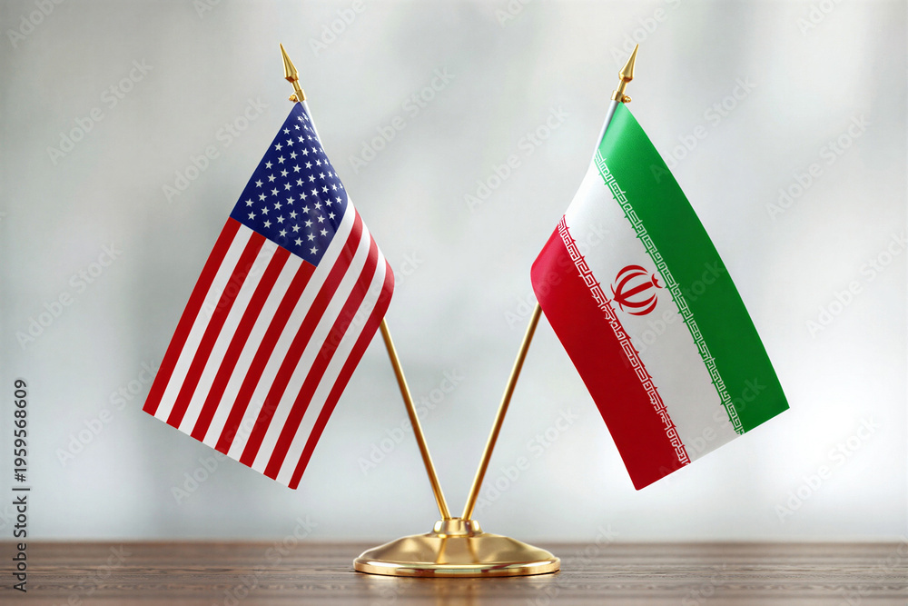 United States and Iran flags side by side on table #1959568609