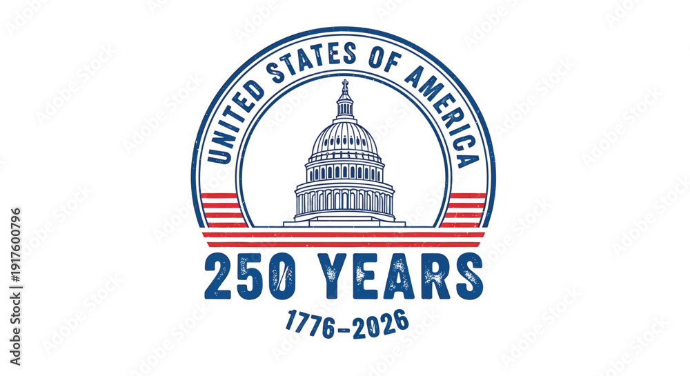 United States of America 250 years anniversary logo, vector illustration of Capitol building with American flag, commemorating 1776-2026. #1917600796