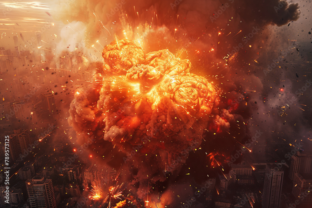 Urban area under assault from a missile, causing a massive explosion #789573125